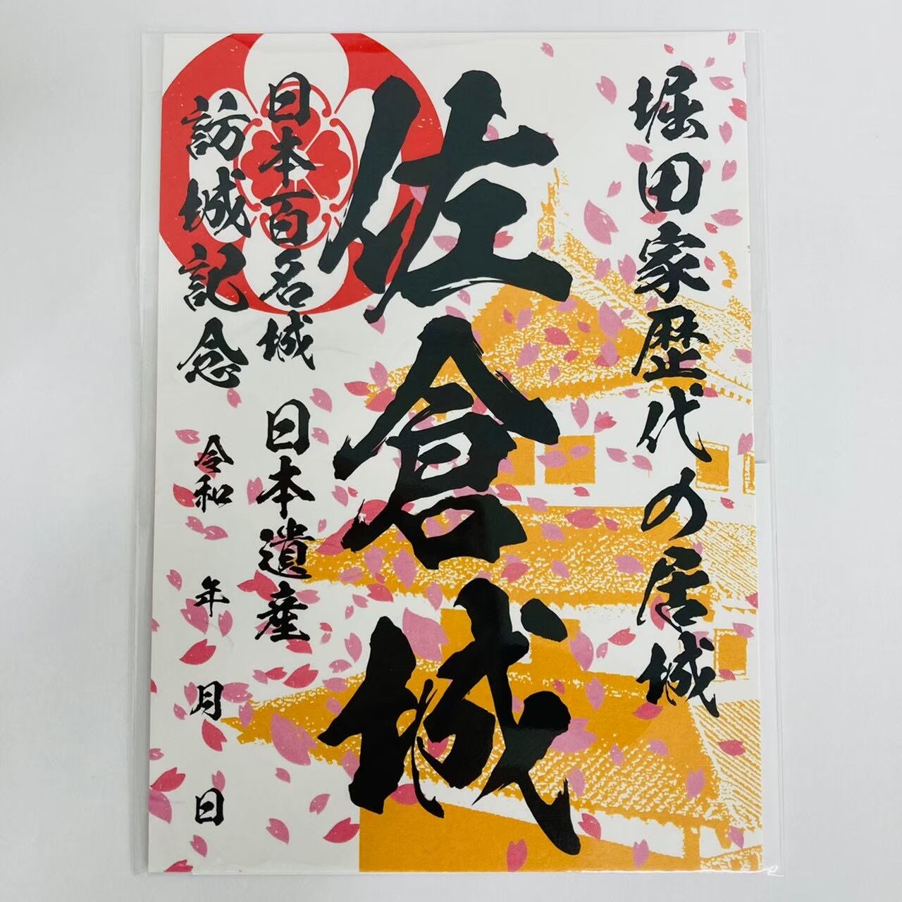 佐倉城には天守閣となる御三階櫓があり、 佐倉城のシンボルとなっていま したが、文化10年 (1813年)に焼失し、その後は再建されませんでした。 御城印においては、この御三階櫓の在りし日の雄姿を描くとともに、現在千 葉県下有数の桜の名所となっている佐倉城址のイメージをあわせてデザイン 化しています。 また、 江戸期に幕政を支えた堀田家の家紋も背景として、あし らっております。