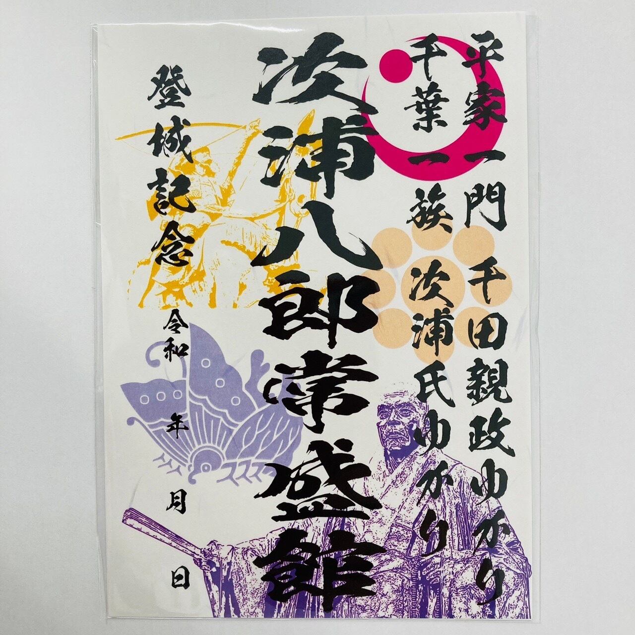 このように、次浦八郎常盛館が平家政権ゆかりの城館 であることから、御城印には平家の家紋を入れました。 そ して、その後の領主である千葉一族の家紋 「月星」「九曜」 を配置しました。さらに平清盛と千葉常胤という次浦にゆ かりのある平家、 千葉一族の二家を象徴する2人をモチー フにしました。